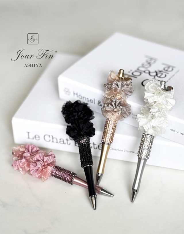 ジュールフィンラブリボンの【フリルペン】です♪ 木馬リボン2種類を組み合わせたフリルや、キラキラデコパーツが付いたエレガントで大人かわいいペンです。 ピンク•ブラック•ゴールド•シルバー4種類のボールペンの中から選んでいただいて(写真1枚目)、リボンのフリルも①グログランリボン(写真2〜4枚目)と②オーガンジーリボン(写真5、6枚目)の中からお好きな色の組み合わせでお作りいたします。 ご注文をいただいてから仕入れ•制作をいたしますので、発送まで3週間ほど日数をいただきます。 ひとつひとつ手作りなので、写真とは雰囲気が多少ことなります。 ハンドメイドにご理解いただける方に、ご購入をお願いいたします ご自分用としてはもちろんですが、プレゼントにもいかがでしょう?