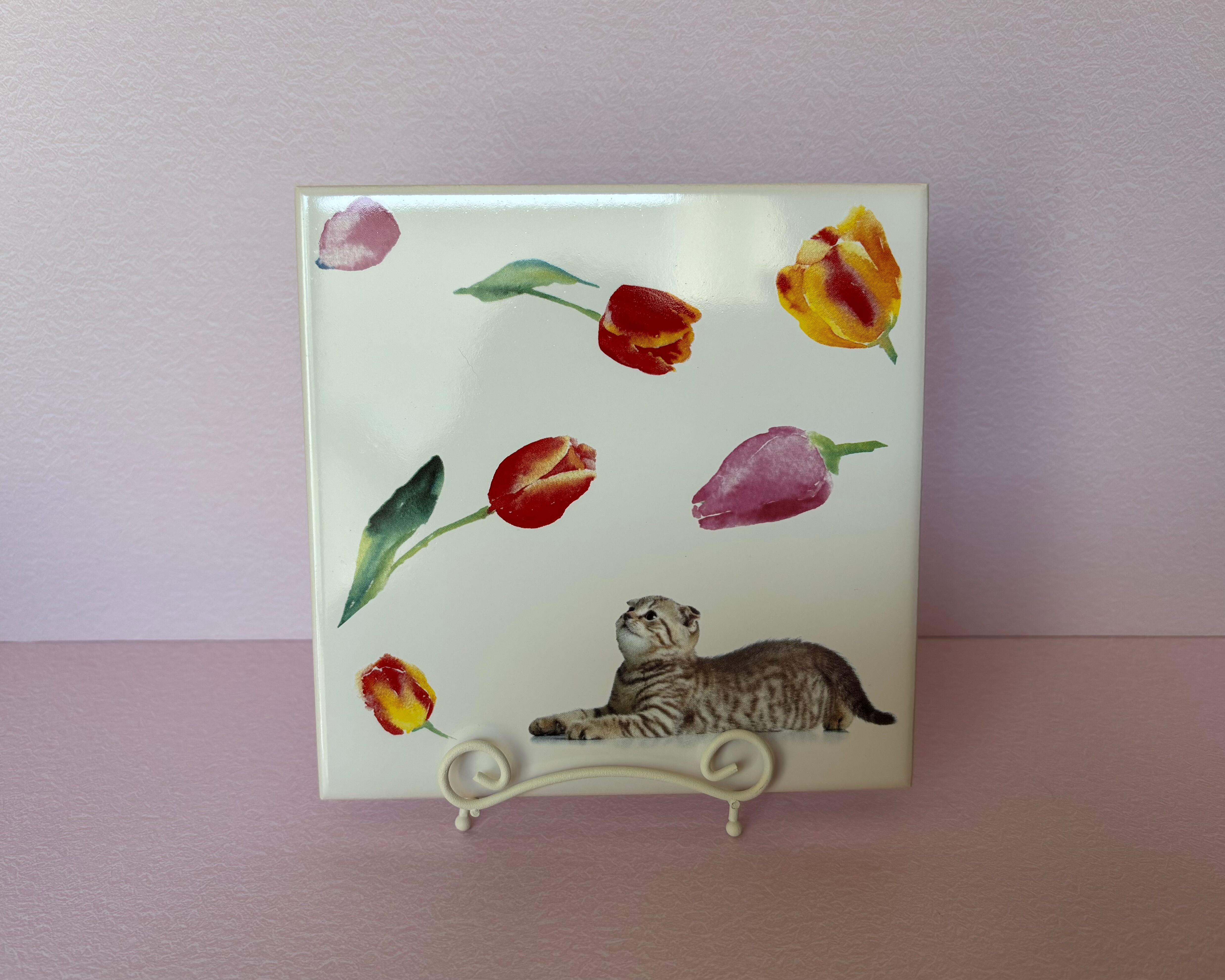 ポーセラーツのタイルアート(大)チューリップと猫①です♪