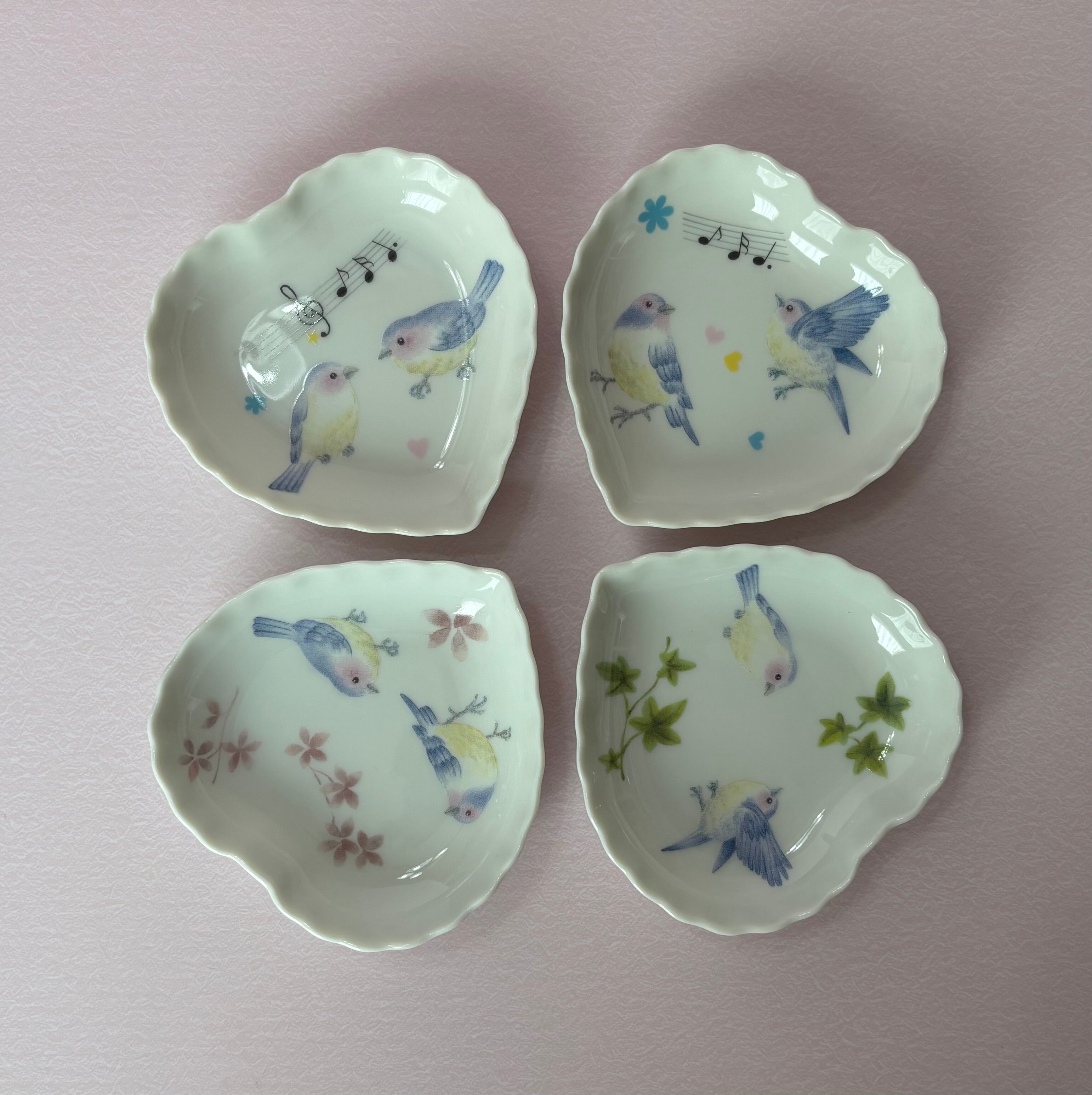 鳥さんのハートの小皿2枚セット②も出品しておりますので、3枚目の写真のように4枚セットでもお使いいただけます。