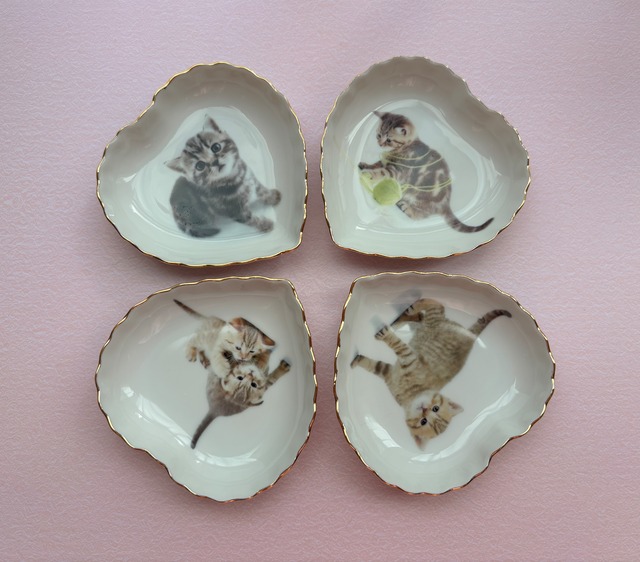 ポーセラーツ…猫ちゃんのハートの小皿4枚セット⭐︎金彩つき♪ サイズは幅の広いところで測って、約9×8.5×高さ2センチくらいです。 小皿としてはもちろんですが、小物入れ、アクセサリー入れ、ティーパックトレイなどにもいかがでしょう? 白磁の性質上、黒点や小さな穴、部分的な膨らみ、薄い変色などがあるものもございます。気にならない方にお願いします。 ハンドメイドですので、市販のものほど完璧ではありません。ご理解いただける方ににご購入をお願いいたします。 金彩かしてありますので、電子レンジこご使用は不可になります。 小皿の裏は、写真2枚目のような感じです。 金彩なしも出品しております。 ご注文いただいてから制作いたしますので、発送まで10日ほどいただきます。 他のサイトでも出品しておりますので、売り切れになることもございますが、ご了承ください。 こちらの商品は、ラッピングはできません。